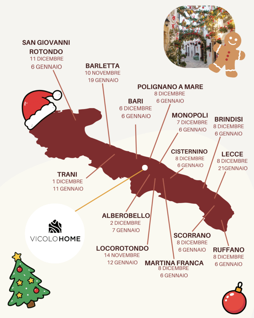 - 📅 Date mercatini 2025: dal 6 dicembre al 26 dicembre. Visit Puglia+2Newsroom Italia+2